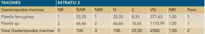 También ha sido destacado en Patella sp. el alto grado de fragmentación (62 NR de 28 NMI), muchos de los cuales se han debido al arduo proceso de extracción de los restos de la brecha. Además de ello, se han registrado 9 individuos de Patella sp. con un proceso de carbonificación intensivo, a tenor de la coloración que presentan. Por último, la zona de recolección en este nivel de ocupación está claramente delimitada, al presentar un conjunto compuesto por especies que habitan en sustratos rocosos del mesolitoral de la costa abierta.