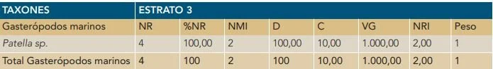 Desde el punto de vista de la representatividad taxonómica, el estrato 3 se ha configurado como el más pobre, con la única presencia de gasterópodos a partir de 4 restos de un número mínimo de 2 individuos de Patella sp. El índice de constancia refleja una probabilidad baja de documentar esta especie en el yacimiento (C = 10,00%). El proceso tafonómico más visible ha sido la cementación, producto del elevado grado de brechificación del estrato (fango micrítico). La coloración grisácea que presenta una de las conchas de Patella sp. puede guardar relación con procesos de carbonificación producto de su exposición al fuego.
