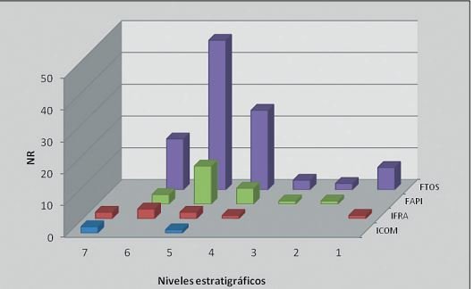 Por último, los índices de fragmentación sobre Patella sp. a partir del NR del conjunto de estratos reflejan un predominio de FTOS, especialmente acusado en los estratos 5, 4 y 6, mientras que se muestra ausente en el estrato 7 (FIGURA 11.8). Por contra, se ha podido documentar ICOM en los estratos 7 y 5 e IFRA en todos los estratos excepto en el 2 y 3 (FIGURA 11.8). Por último FAPI está ausente tan sólo en los estratos 7 y 1. De todo ello podemos concluir que el grado de conservación en general es bueno, en parte gracias al proceso de brechificación sufrido, que ha permitido además mantener el material in situ, necesario para establecer un análisis espacial (ver capítulo 17).