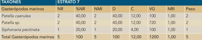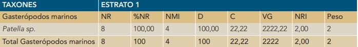 Por último, la única documentación de Patella sp. es un indicador del tipo de ambiente frecuentado por estos grupos humanos para las prácticas de recolección de moluscos. De este modo, podemos advertir que la zona de recolección fueron sustratos duros de la zona mesolitoral de la costa abierta.