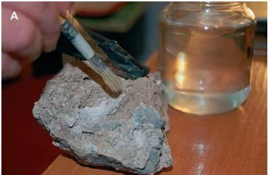 En nuestro caso trabajamos con Paraloid B72 soluble en acetona al 5%, 10% e incluso al 30%, según la dureza de la brecha (FIGURA 11.1A). En algunos casos se diluyó en xileno en detrimento de la acetona, dada su mayor operatividad para la penetración en el carbonato cálcico de las conchas.