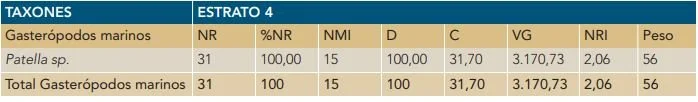 La única representación taxonómica constatada en el estrato 4 ha sido el gasterópodo Patella sp., del que han sido documentados un total de 31 restos pertenecientes a un número mínimo de 15 individuos (NRI = 2,06). El índice de constancia refleja una probabilidad media-baja (C = 31,70%) de encontrar dicha especie, presentándose como el estrato donde este valor es más elevado, indicativo quizás de que nos encontramos ante un nivel de ocupación donde la explotación de recursos marinos fue un complemento importante de la dieta de estas comunidades.