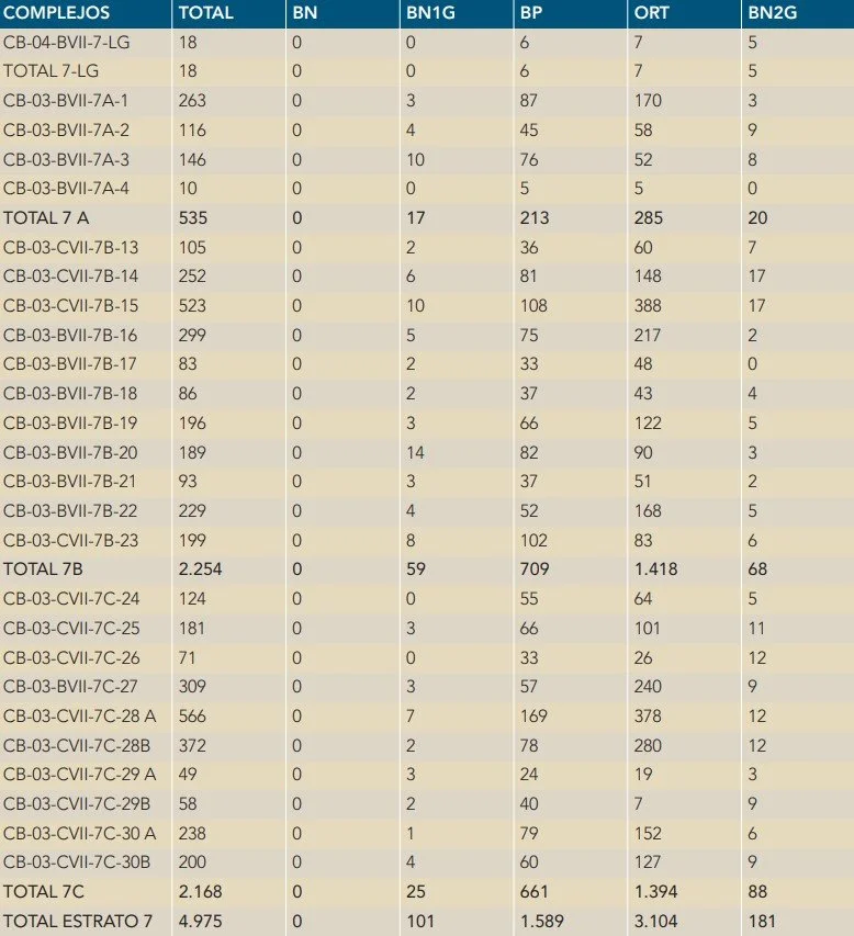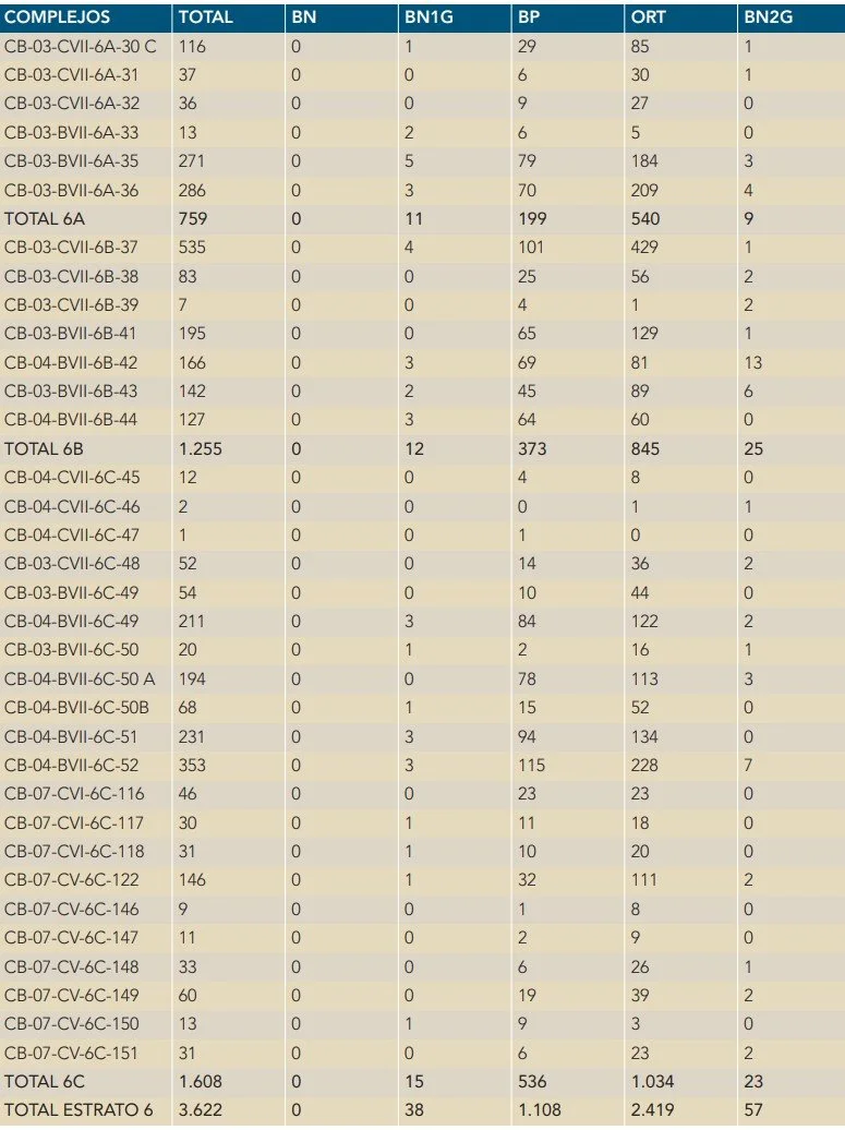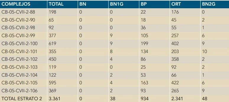 Una distribución de productos parecida se aprecia en la cuadrícula del estrato, que alcanza el segundo lugar en cantidad —CVII del estrato 6 A, con 759 efectivos—. Entre ellos destacan 540 ORT, 199 BP, 9 BN2G y 11 BN1G (TABLA 15.4).
