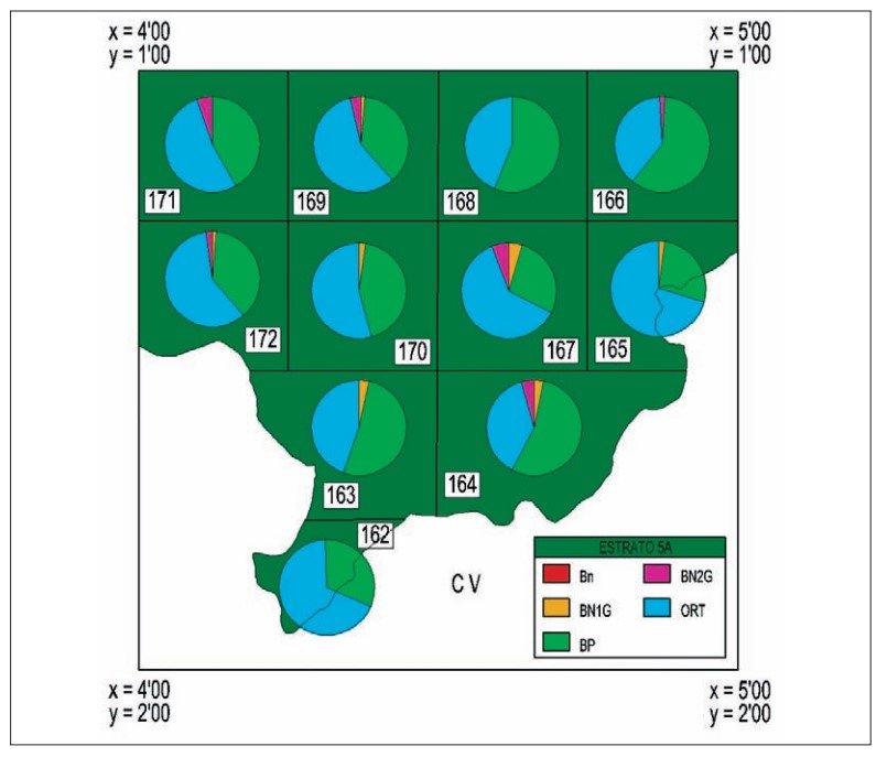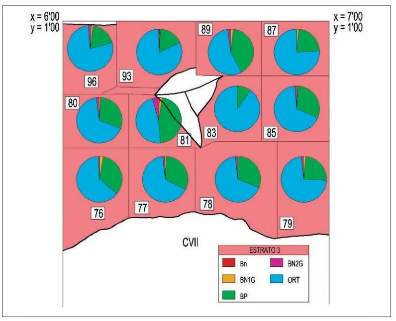 Están documentados en dichas dimensiones espaciales, 2 ejemplares de BN1G, 93 BP, 265 ORT y 9 BN2G. Se repite por tanto la tendencia observada e indicada para el estrato 2