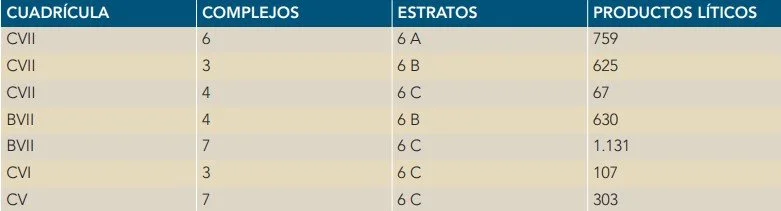 Del estrato 6 se han analizado 3.622 productos líticos tallados. Proceden de cuatro cuadrículas: BVII, CVII, CVI, y CV y de los subestratos 6A, 6B y 6C (FIGURA 15.7). En concreto su distribución considerando cuadrículas, complejos y subestratos es la siguiente