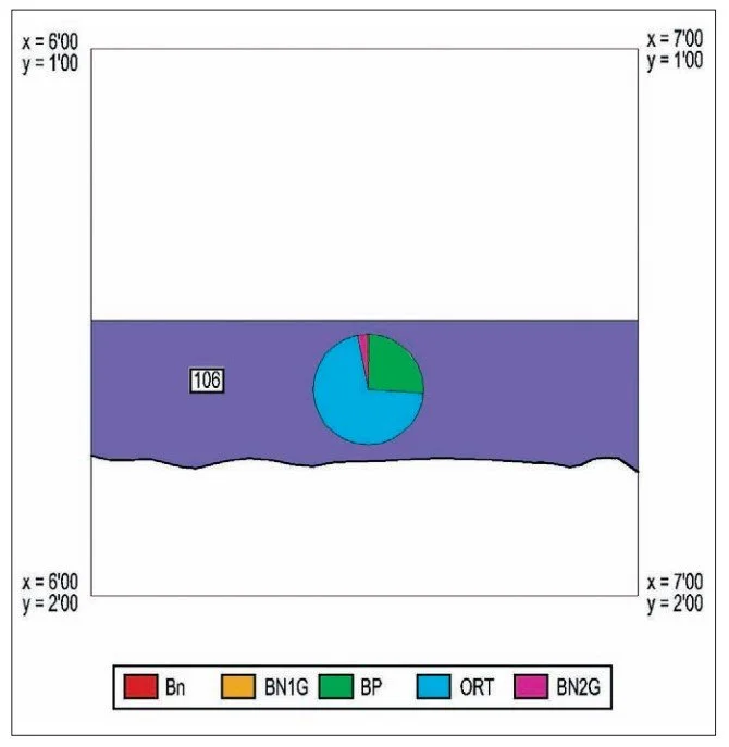 En cuadrícula CVI se documentan en 3 complejos, el predominio de ORT, seguidos de BP, BN2G y BN1G. En cuadrícula DV se aprecia en 5 complejos el equilibrio cuantitativo de ORT y BP (80 ejemplares en total), seguidos de BN2G (11 ejemplares) y BN1G (5 ejemplares).