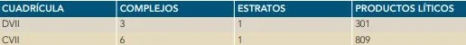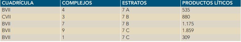 A pesar de lo complejo de este tipo de valoraciones, en el espacio comprendido en el estrato 2, en sus 11 complejos excavados (TABLA 15.2; FIGURA 15.2) se aprecian productos arqueológicos que manifiestan procesos de producción de productos líticos, con escasos ejemplares de BN1G, gran presencia de ORT, destacada documentación de BP y un limitado registro de productos retocados-BN2G.