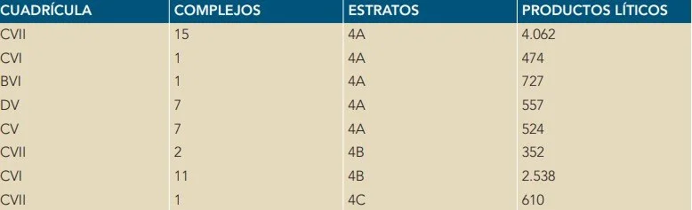 Del estrato 4 se han analizado 9.844 productos líticos tallados. Proceden de 6 cuadrículas: CVII, CVI, BVI, DVI, DV y CV