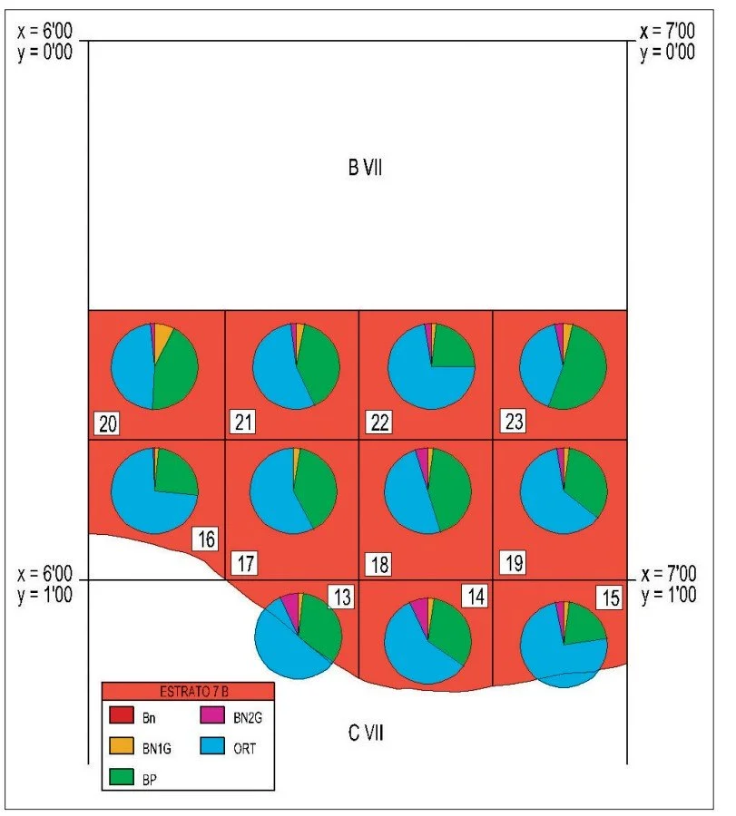 La cuadrícula BVII en el Estrato 7B constituye el segundo ámbito mejor representado con 1.374 efectivos. En esta cuadrícula y estrato se documentan 822 ORT, 484 BP, 41 BN1G y 27 BN2G (TABLA 15.7).