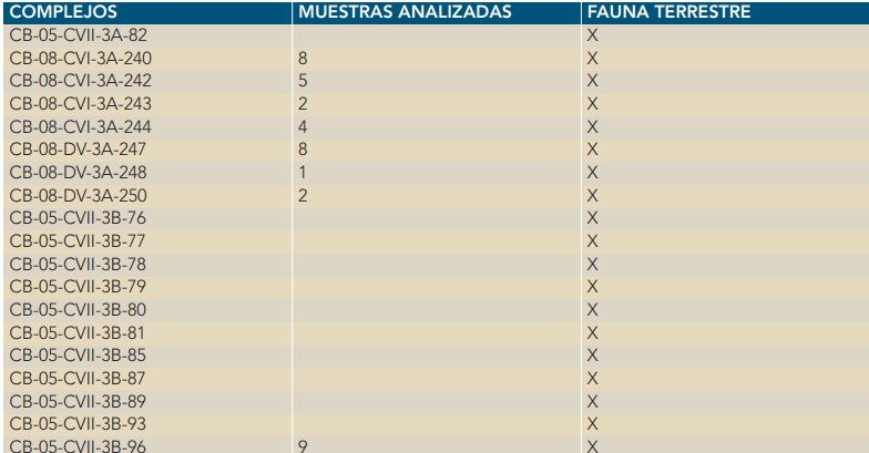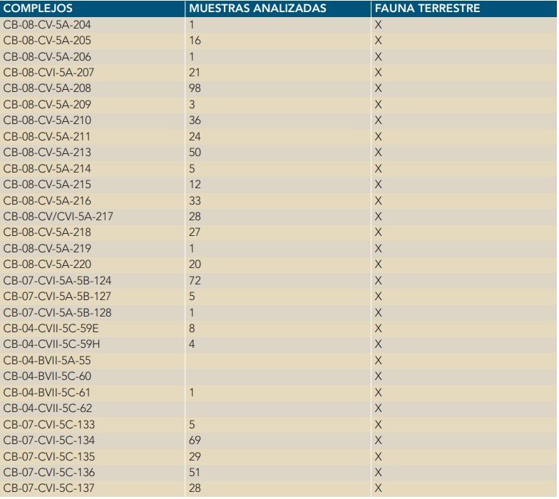 Tabla 16.2. Relación de cuadrículas y complejos con presencia de fauna terrestre del Estrato 6