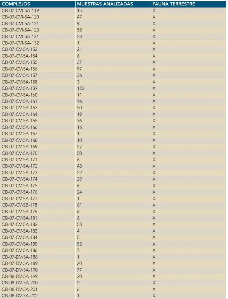 Tabla 16.7. Relación de cuadrículas y complejos con presencia de fauna terrestre del Estrato 1