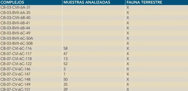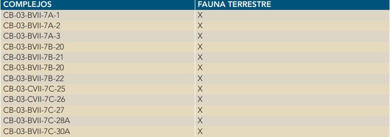 Tabla 16.1. Relación de cuadrículas y complejos con presencia de fauna terrestre del Estrato 7