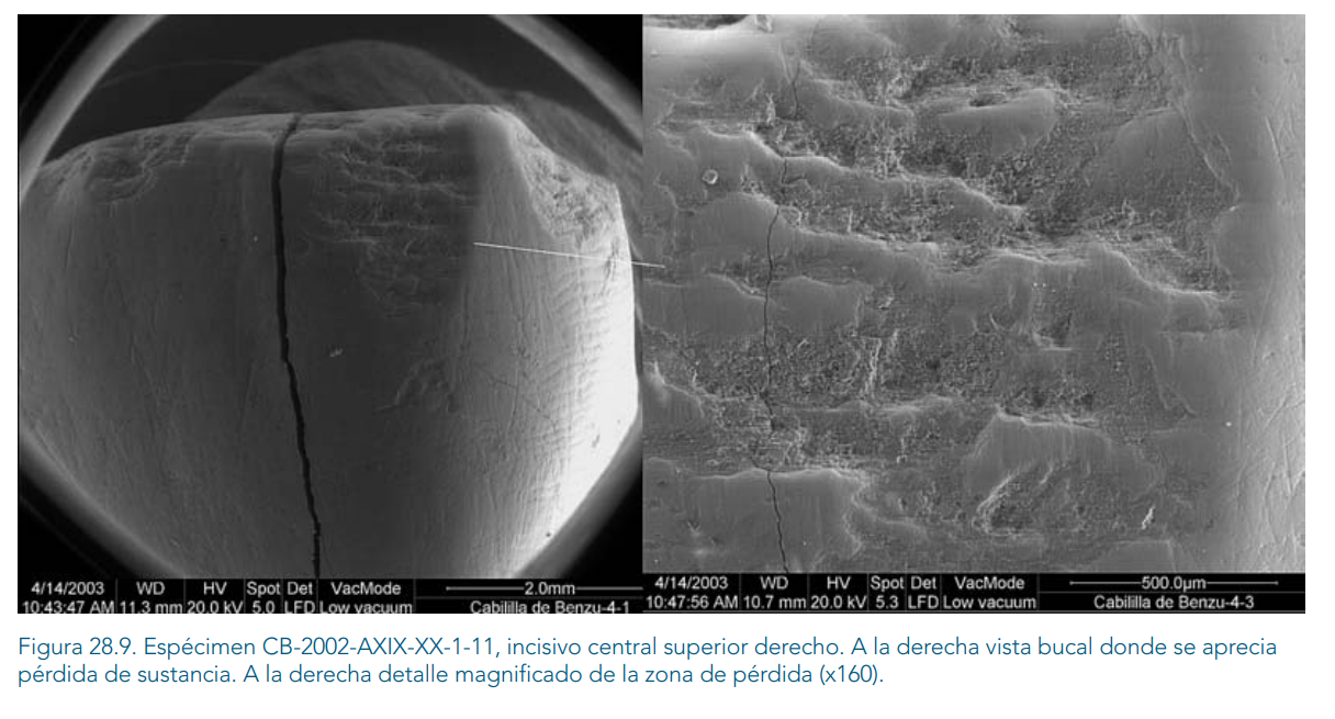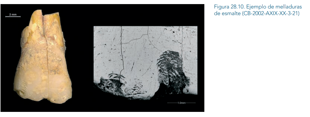 Durante la vida del individuo se producen en los dientes una serie de modificaciones y desgaste debido a su normal uso, tanto el producido por la masticación de los alimentos como el desgaste no relacionado directamente con la masticación, el denominado desgaste paramasticatorio (Bonfiglioli et alii, 2004). Entre este último, cabe destacar aquellas modificaciones relacionadas con el uso de la dentición anterior como tercera mano, por ejemplo para ayudarse en la preparación de comida, elaboración de utensilios o el curtido de pieles, como ocurre tanto en poblaciones contemporáneas del pueblo Inuit de Alaska, como en poblaciones prehistóricas, y que originan las llamadas estrías culturales. En la población de la Cueva de Benzú se han encontrado varios incisivos y caninos con esta modificación (FIGURA 28.8), como por ejemplo, el incisivo central superior CB-2002-AXX-XXI-1. Existen además otras señales del uso de la dentición con fines no masticatorios, como son las melladuras o pérdida de esmalte in vivo, que aparecen en el borde incisal de la dentición anterior y en el margen ocluso-bucal de algunos premolares. Estas melladuras suelen estar relacionadas con el reto que del filo de instrumentos líticos, entre otras actividades. En este yacimiento, se ha observado esta modificación en numerosos incisivos superiores (CB-2002-AXIX-XX-1-11, FIGURA 28.9; CB-2002-AXIXXX-3; CB-2002-AXIX-XX-3-21, FIGURA 28.10), así como en algún molar, que presentan descamaciones de esmalte muy posiblemente producidos en vida como consecuencia de masticar o manipular con la boca sustancias duras.