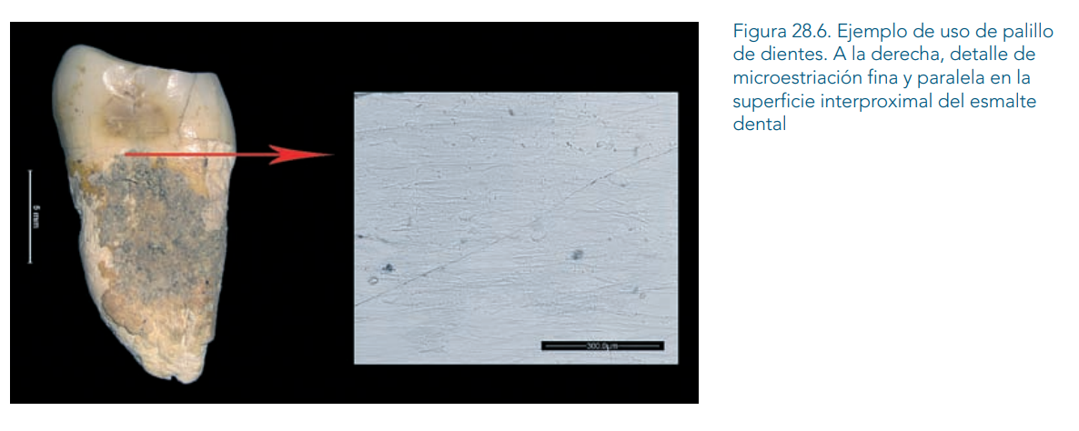 El hecho de que los depósitos que se conserven sean de gran tamaño y espesor, incluso llegando a toda la superficie lingual de algunas piezas dentales (FIGURA 28.5), es un indicador de la escasa higiene oral que esta población tenía. Paralelamente, se han encontrado trazas del uso de palillos de madera en 2 piezas molares, que se caracterizan por la presencia de microestriación fina y paralela (Bonfiglioli et alii, 2004; Formicola, 1988) en la superficie interproximal del esmalte dental (FIGURA 28.6). Estas marcas se producen por el uso reiterado de finos palillos vegetales o tendones animales con fines paliativos, terapéuticos o de higiene, similar a la seda dental actual.