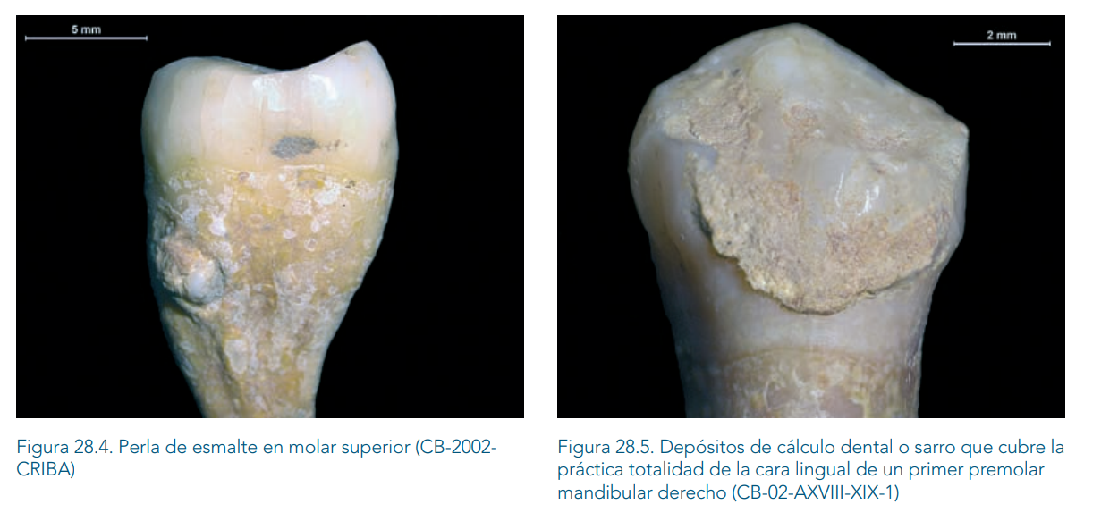 En este mismo sentido, cabe también señalar el tamaño pequeño (longitud y anchura) de las raíces, tanto de la dentición anterior (incisivos y caninos) como de la dentición posterior (premolares y molares). Como curiosidad, se ha encontrado un molar superior con «Perla de Esmalte» (FIGURA 28.4). Se trata de una malformación que consiste en la secreción de esmalte dental en forma esférica, generalmente en la raíz de los molares maxilares o superiores (Brothwell, 1981). Es poco frecuente y generalmente inocua, aunque puede causar problemas durante una enfermedad periodontal si la raíz se ve afectada, o el esmalte de la perla sufre caries. En este caso (segundo molar superior derecho CB-2002- CRIBA), no se ha apreciado ninguna patología, con lo cual es probable que el individuo que la poseía, ni siquiera se hubiera percatado de su presencia en vida.