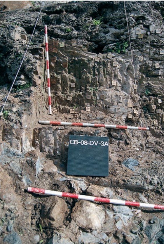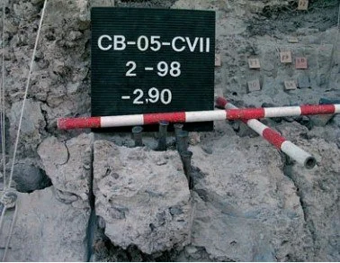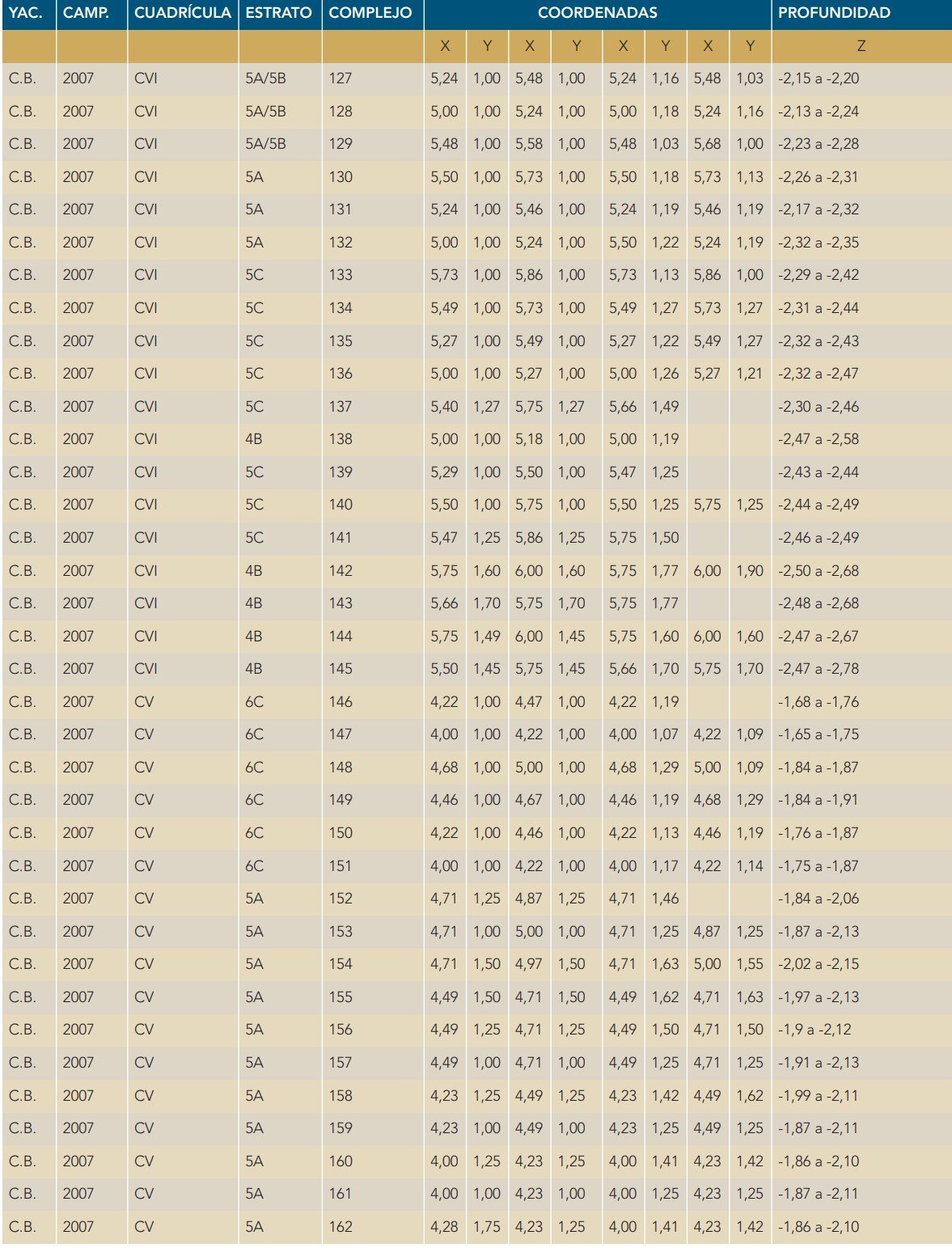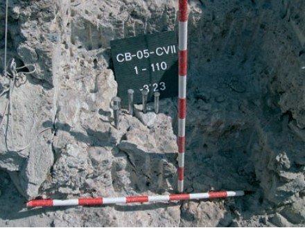 Con ello se cumplieron ya parte de los objetivos planteados para la presente campaña en esta cuadrícula. Intentamos entonces definir en esta zona del yacimiento la situación de la roca de sustrato en la cuadrícula CV. Por su parte en el complejo CB08-CV-3A-233 se localizó el estrato 3A, conformado por fango micrítico. Sus coordenadas son: