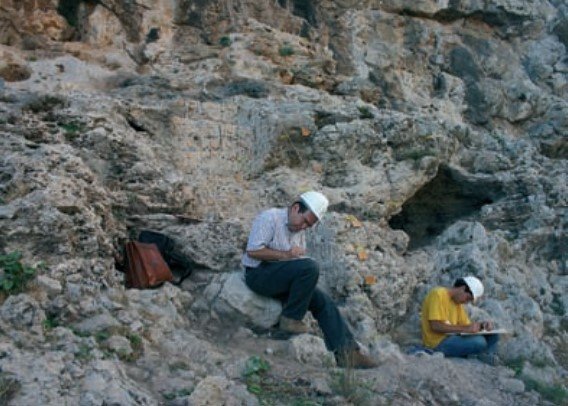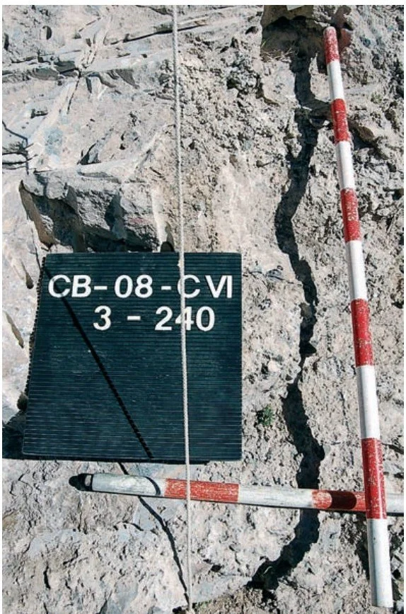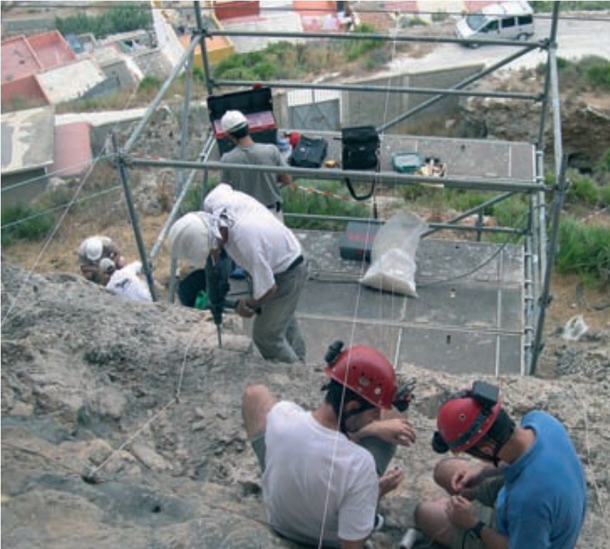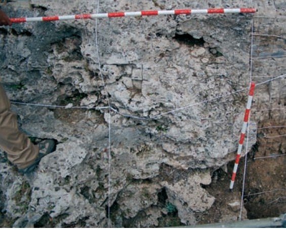 Se experimentó con una excavación en vertical, desde este nivel superior, con cinceles y martillos, e incluso se probó el empleo de ácidos clorhídrico y acético, para intentar disgregar o disolver el ce mento carbonatado de la brecha, formado fundamentalmente por calcita (CaCO3).