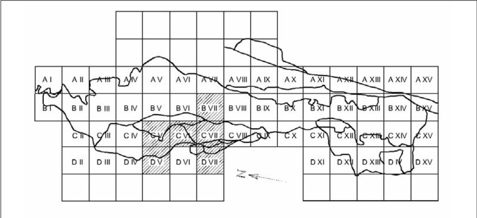 Figura 6.4. Sistema de cuadrículas con indicación de las excavadas en la campaña del año 2002