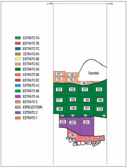Los trabajos topográficos y planimétricos desarrollados han permitido integrar en el sistema de excavación a la cueva y al abrigo, por medio de un sistema de cuadrículas, desde A I a Z XV y de D III a D XV (FIGURA 6.3)