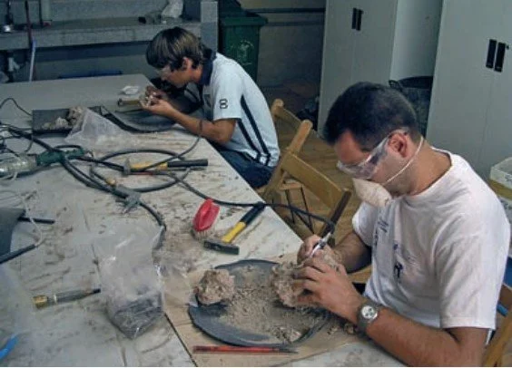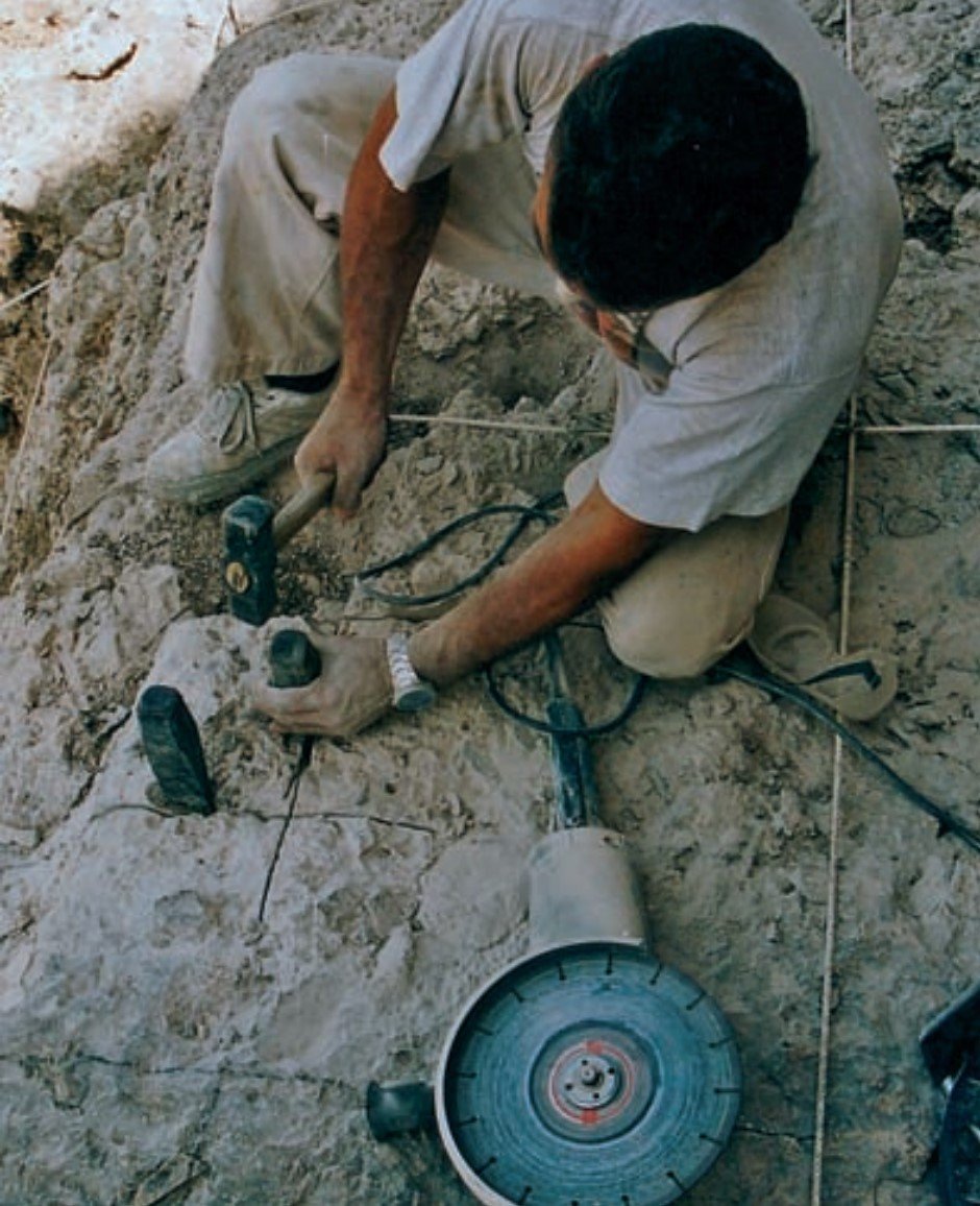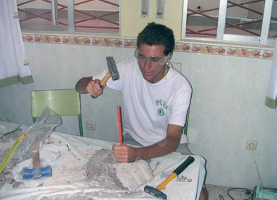 Figura 6.6. Trabajos de excavación de un producto lítico con martillo y cincel tras la aplicación de ácido clorhídrico