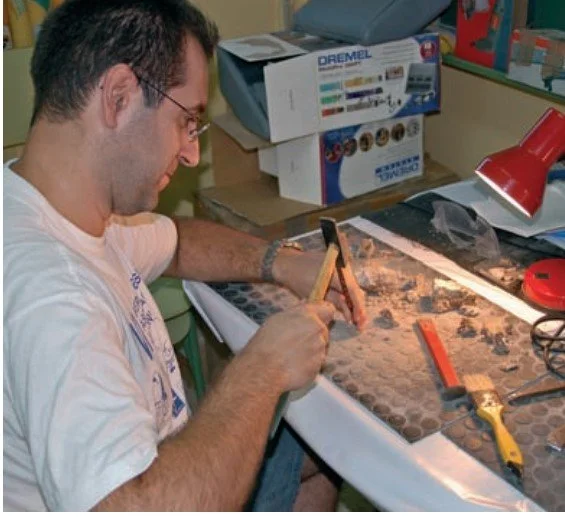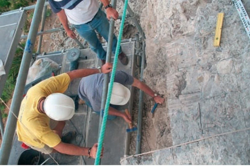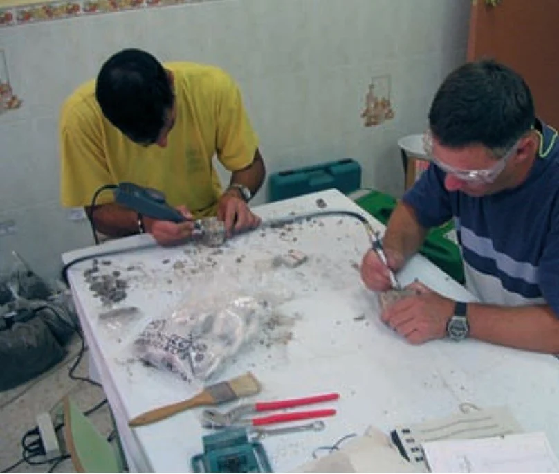 Figura 6.13. Trabajo mediante pequeños cinceles, para ir disgregando el bloque y separando los fragmentos con restos visibles