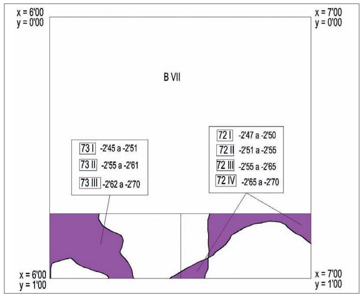 Excavamos en el estrato 7 las cuadrículas: AV, BII, BVI, CII, CIII, y en el estrato 4, la cuadrícula CIII y la CIX —FIGURA 6.4— (Ramos, Bernal y Castañeda, eds., 2003: 255 y ss.).