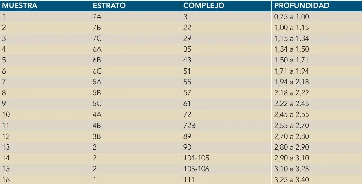 Así pues, se trata de una metodología muy similar a los trabajos de cantería, procediendo a delimitar el espacio a excavar en cuadrículas de 25 × 25 centímetros, aproximadamente, cada una de las cuales al final ha constituido un complejo-unidad estratigráfica, que se han ido excavando de manera correlativa, en relación a los estratos (TABLA 6.1).