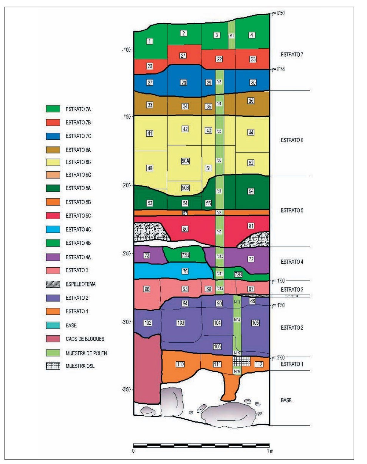Hemos realizado un plan de datación que ha permitido obtener una síntesis cronológica de las ocupaciones en el yacimiento. Se han utilizado diversas técnicas analíticas de datación (ver capítulo 7). Los estratos sedimentarios de la base de la secuencia han sido datados por OSL (Bateman y Calado, 2003) y se ha utilizado el Th/U (Durán, 2004) para la determinación de la edad de los espeleotemas. Paralelamente se ha empleando el método experimental de TL en la datación de espeleotemas (Millán y Benéitez, 2003a; Benéitez et alii, 2003 y 2004).