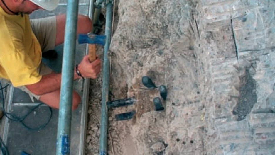 A continuación se procedía a realizar en una segunda etapa una serie de cortes perimetrales con sierra radial eléctrica, hasta la profundidad que permite el diámetro del disco, es decir unos 7-9 centímetros. Tras este proceso, se perforaba a profundidades de 15 centímetros en vertical y de 25 centímetros en el plano x, y, horizontal, con taladros percutores, tanto los vértices del paralelepípedo, como los laterales, con equidistancias de 5 centímetros.