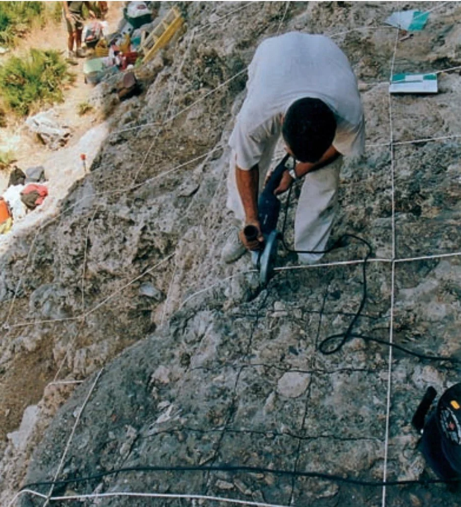 fauna quedaba ahora mejor tratada y sometida a menores riesgos. En todos los casos, dicha fauna se ha consolidado con Primal, rebajado al 50%.La industria lítica, una vez recuperada del interior de la brecha, ha sido cuidadosamente limpiada mediante cubeta de ultrasonido con adición de bicarbonato sódico. Se ha calculado el porcentaje en volumen de roca excavada que se pierde o destruye mediante esta metodología y que corresponde al volumen de los taladros realizados en la brecha para alojar las cuñas y a los cortes realizados con la sierra circular. Para cada bloque de roca extraído, con un volumen total de 9375 centímetros cúbicos por bloque, la cantidad perdida sería de 300 centímetros cúbicos para los cortes de la sierra y de 251,328 centímetros cúbicos para los taladros para las cuñas. Esto representa un total de 551,328 centímetros cúbicos, es decir: el 5% aproximado del volumen de roca recuperado. El porcentaje de un 95% aproximado de roca recuperada en nuestro caso, se puede considerar como realmente ventajoso, en relación con la cantidad perdida y/o destruida de material, en una excavación sobre el terreno con metodología convencional.