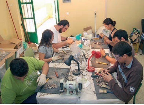 Figura 6.147. Trabajos de laboratorio de procesamiento de bloques-complejos en el colegio Ortega y Gasset durante la campaña de 2008 en el Abrigo de Benzú