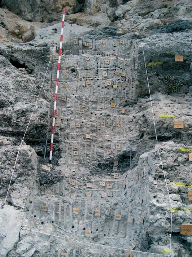 Como hemos indicado este procedimiento técnico desarrollado a finales de 2002 se aplicó en la campaña de 2003, en la que fue excavado el tramo superior de la secuencia estratigráfica de la brecha — estrato 7 — (brecha cementada con bloques) y — estrato 6 parcialmente — (fango micrítico con presencia de escasos cantos carbonaticos subangulosos).