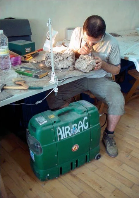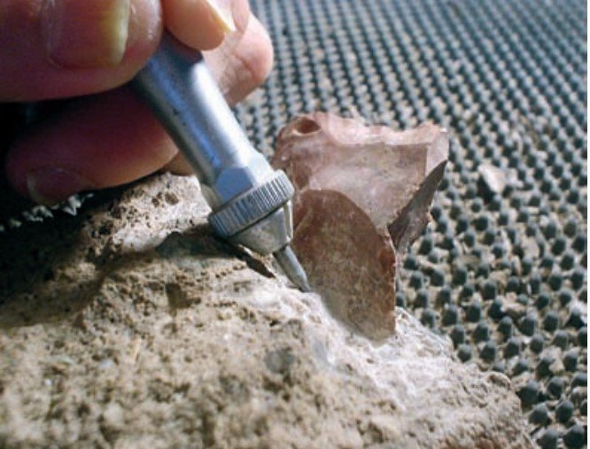 Figura 6.15. Trabajo mediante herramientas de micropercusión para un disgregado de precisión y recuperación de los restos líticos y de fauna