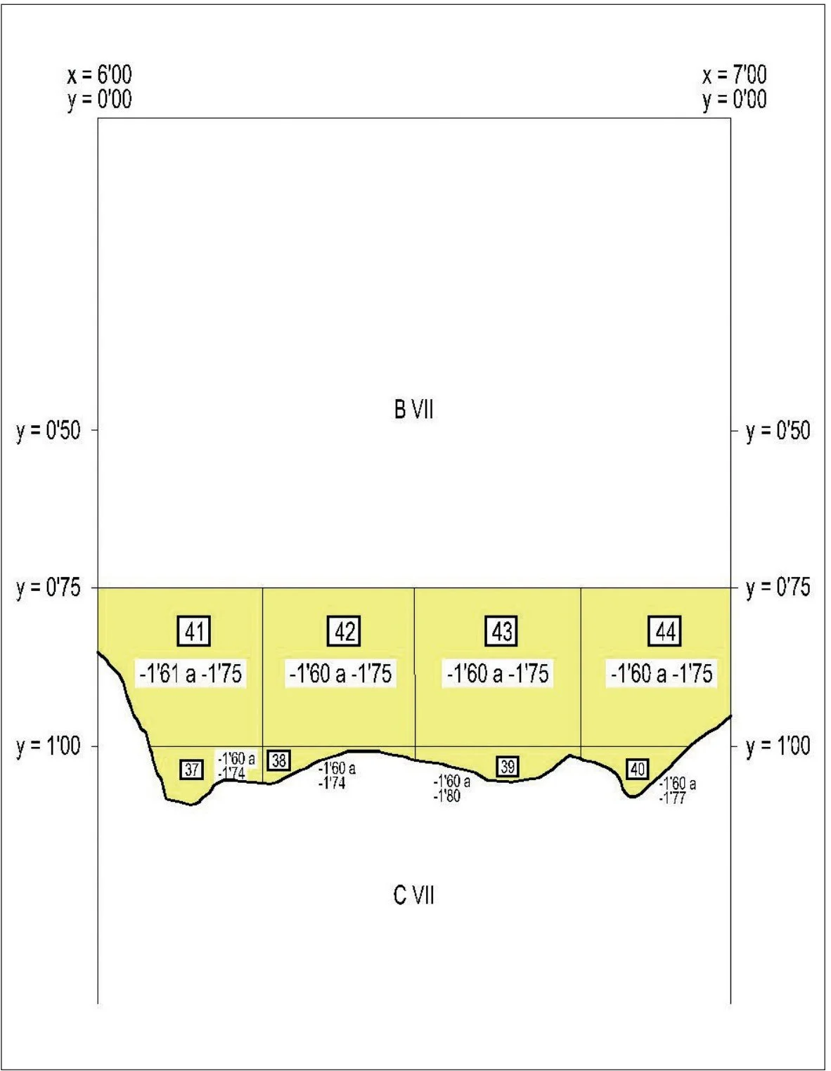 En el mencionado espacio y en concreto en las cuadrículas BVII-CVII se excavó en los estratos 7 y 6 durante la campaña de 2003, en los estratos 5 y 4 en la campaña de 2004 y en los estratos 3-2-1 en la de 2005. En este último año se completó el sondeo inicial, excavando parcialmente la cuadrícula DVII.