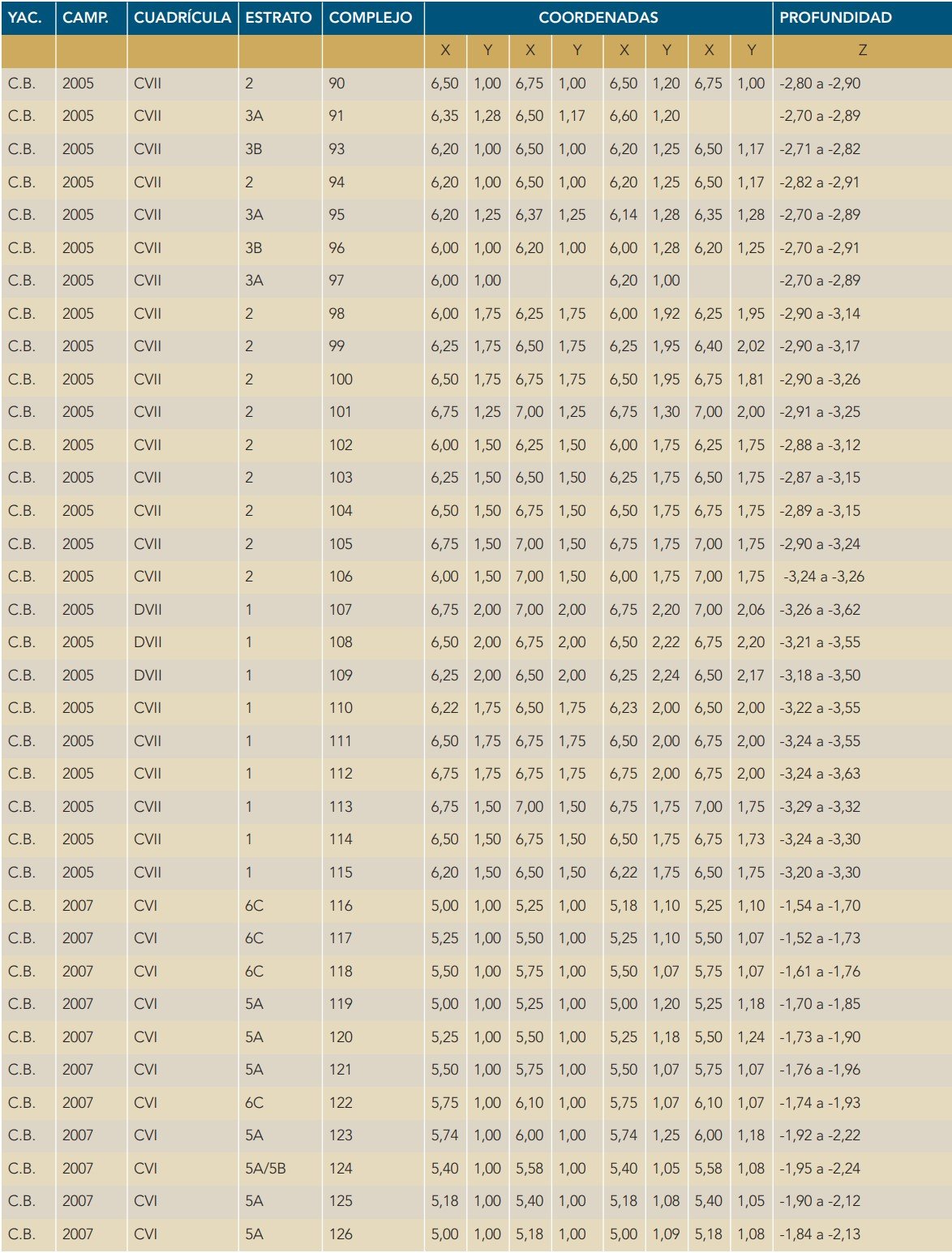 Tabla 6.1. Relación de campañas de excavación, cuadrículas, estratos, complejos y coordenadas