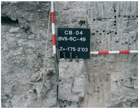 En la campaña de 2003 se inició el proceso de extracción de bloques de 25 × 25 × 15 centímetros de longitud/anchura/altura, con este material técnico, siguiendo la cuadrícula de excavación ya trazada y posicionada en un sistema de referencia (FIGURA 6.4), delimitando espacios en planta y perfil, de nominados complejos, en las cuadrículas BVII y CVII. El sistema consistía en realizar cortes perimetrales, sobre los planos x, y, z de dichos bloques, me diante la sierra circular, capaz de penetrar en la brecha unos 7 centímetros, con un espesor de corte de unos 4 milímetros (FIGURA 6.8). El paso siguiente ha consistido en la realización de taladros con broca de CW de 15 centímetros de diámetro, hasta una profundidad de 15 centímetros en la vertical de los planos X e Y y una profundidad de 25 centímetros en el plano horizontal (FIGURA 6.9).