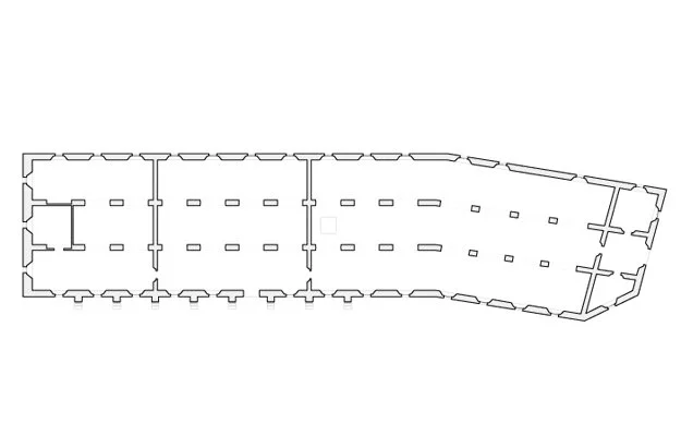 Esta construcción se puede entender como una obra unitaria. Se organiza formalmente mediante un sencillo cuerpo principal de trazado longitudinal, aunque dotado de un ligero cambio de directriz en el primer tercio occidental. La construcción se comprende entonces como un gran volumen principal reforzado hacia el norte por contrafuertes, que se cierra mediante una cubierta inclinada a dos aguas, y que viene a rematar en su extremo oriental en un pequeño patio.