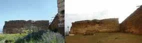 Del tapial y de la puerta de Fez, poseíamos abundante información de trabajos anteriores, proyectos con diagnosis, programación de actuaciones, con utilización de mucha terminología médica, lesiones, prótesis, completamientos terapéuticos, con los restos del arco, que la investigación de los arqueólogos habían aumentado en su esbeltez en dos metros, teníamos que ser cautos pero no enfermizos. En la junta constructiva entre el tapial y la puerta, que era su punto más débil, se adosaba a otro arco de medio punto también quebrado, (ig. nº24). Con la nueva esbeltez el arco pedía un requerimiento de permanencia y de estabilidad. Se optó por colocarlo a una icticia situación de origen. De una manera ya clásica en este tipo de restauraciones, se utilizó ladrillo de tejar y se rehundió la junta de separación constructiva con lo antiguo, a la altura de las dovelas contiguas a la nueva clave.