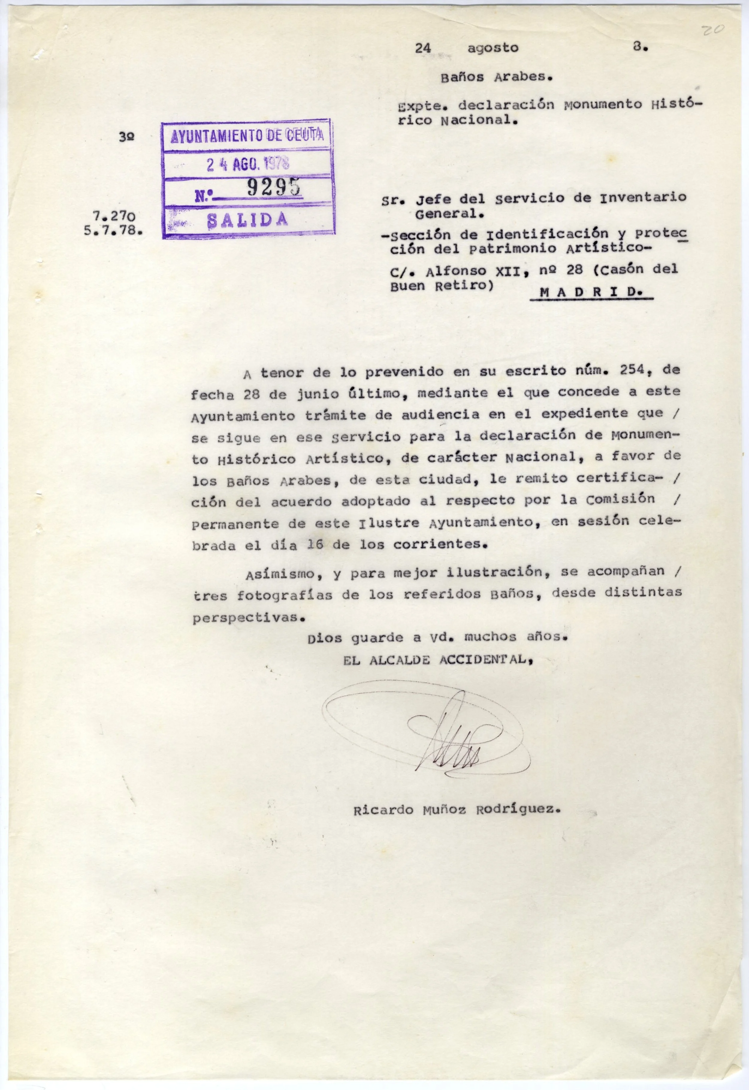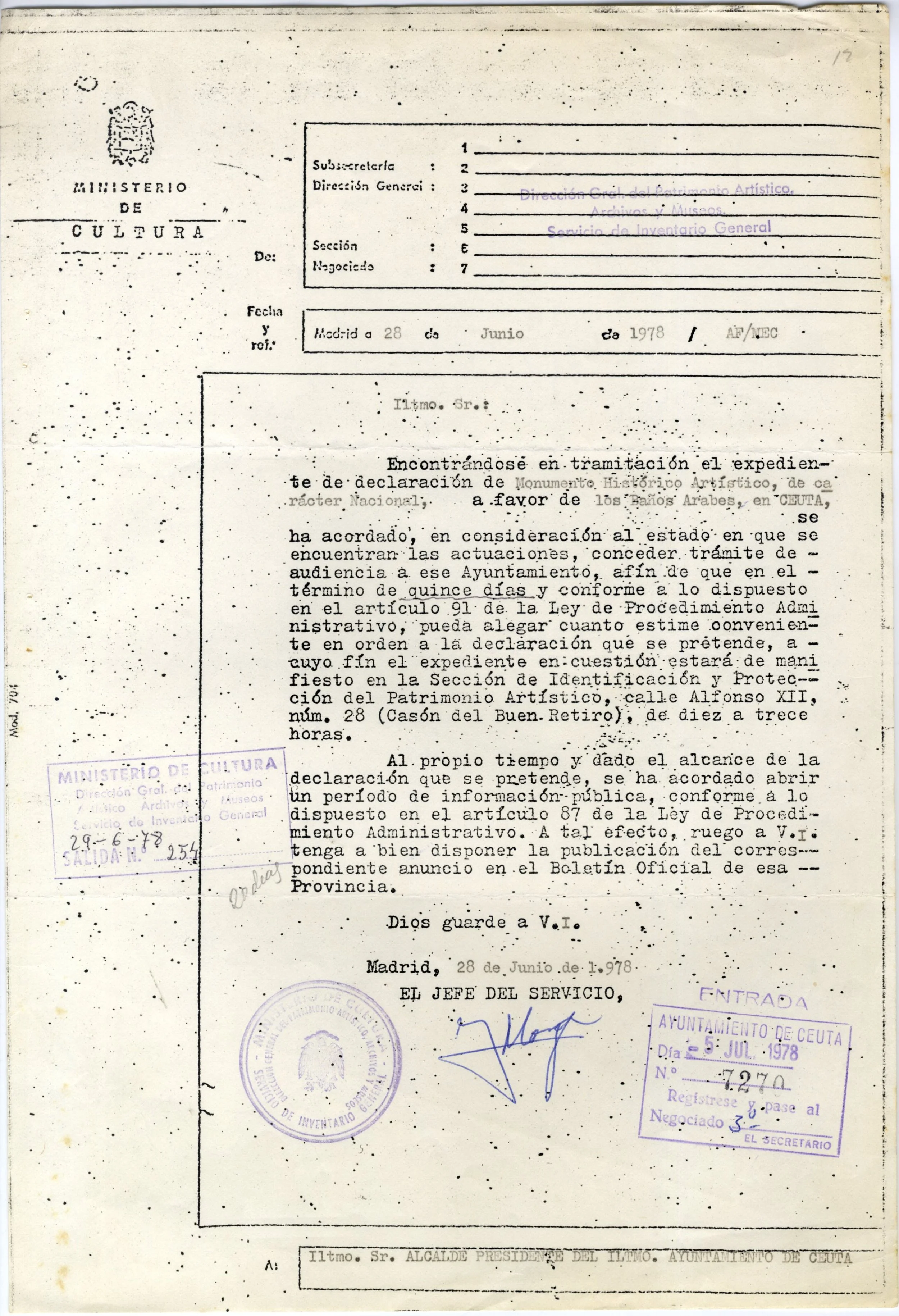 El monumento se situa en una parcela de 1.038,3 m2 sin número registral. Ubicado en la zona de la Almina, concretamente en la denominada Plaza de la Paz (antiguos jardines XXV años de Paz), linda, al Norte con el Paseo de la Marina Española, al Sur con la Calle Galea, al Este con la Calle Simoa y al Oeste con la Calle Tte. Arrabal.