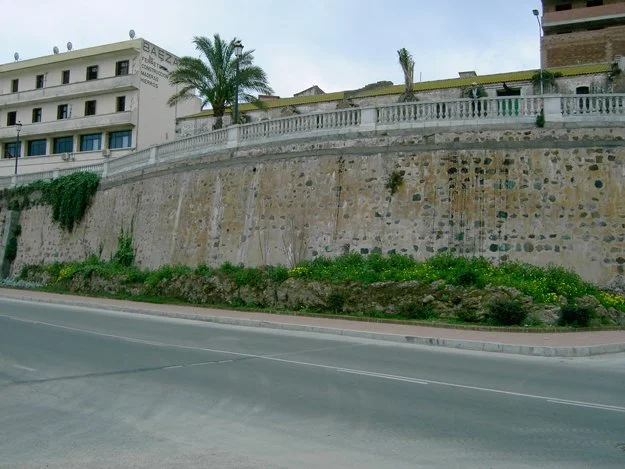 Debido a la propia configuración topográfica de la Almina en la que el frente Norte se convierte en el más accesible por mar, la ciudad se ha visto históricamente necesitada de defender este frente por medio de construcciones de tipo militar. En su origen, se levantó una cortina torreada que servía de defensa a los arrabales islámicos. Tras la conquista de los portugueses, y el posterior abandono de la misma por parte de éstos, la muralla se fue deteriorando, llegando a desaparecer en algunos tramos. Con la repoblación de la Almina en el siglo XVIII se decide dotarla de un nuevo sistema de construcciones defensivas, formada por lienzos de muralla reforzados en puntos estratégicos por baluartes y semibaluartes que se adelantan a los lienzos, zonas de vigilancia con la ejecución de garitas, y puntos de acceso al interior del recinto amurallado, como la Puerta de San Pedro y la de San Sebastián.