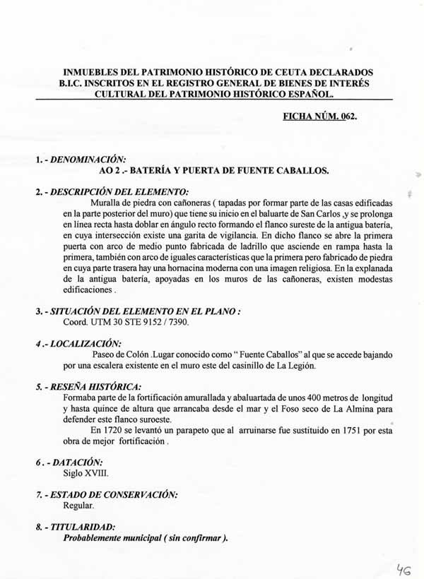 La construcción objeto de atención en esta ficha del Catálogo es un conjunto formado por una batería y la puerta conocida como Fuente de Caballos localizados en el tramo oeste de las murallas de La Almina de Ceuta. Es la salida del recinto amurallado a la playa de San Jerónimo. Este tramo en su conjunto tenía un gran valor estratégico, ya que cierra el frente perimetral oeste, entre dos puntos de acceso al interior del recinto, la puerta de Fuente de Caballos, situada en su extremo más al sur hasta la puerta del Boquete de la Sardina, situada en el foso de La Almina, en el extremo septentrional.