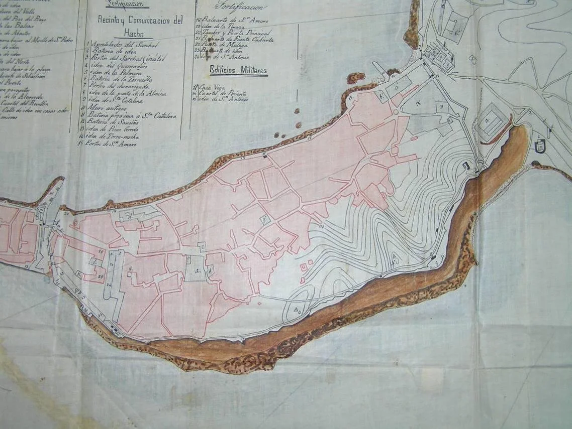 Partiendo de la estructura defensiva del foso de la Almina abierto en torno al año 1.557 según el historiador Alejandro Correa, el desarrollo de la fortificación de este segundo recinto comenzó de inmediato en el mismo año de 1.720 por los sectores oeste y sur mediante un parapeto desde el Agujero de la Sardina a la playa de San Jerónimo (hoy conocida como de la Peña).