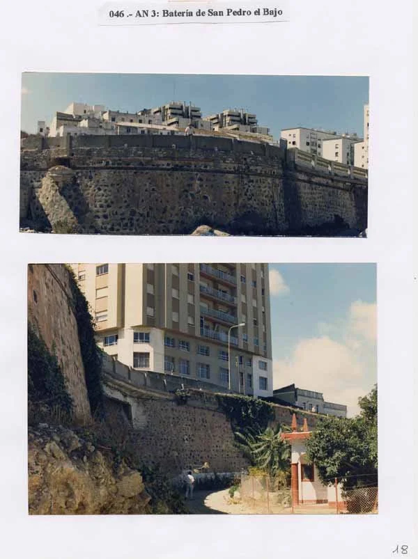 El entorno de la Batería de San Pedro el Bajo (AN3) se caracteriza por su alto grado de consolidación y evolución urbana, hasta tal punto que hoy día es muy difícil reconocer en esta zona el que fue durante siglos límite físico y frontera Norte de la ciudad con el mar. El que fuera camino militar en el S.XVIII ha dado paso hoy día al Paseo de la Marina Española, una vía con tráfico rodado bastante intenso, con doble sentido de circulación que funciona como ronda interna de circunvalación, y que se prolonga en un paseo peatonal que se extiende en algunos puntos por el exterior del propio lienzo de la muralla, modificando el perfil original del trazado del Conjunto Histórico mediante construcciones adosadas por su cara exterior, o bien muros de contención empleados para crear plataformas en la cota de coronación de la muralla, constituyendo el paseo anteriormente citado. Por otro lado, por el exterior de la muralla, los terrenos ganados al mar han sido ocupados por zonas comerciales, deportivas y terciarias cuya gestión corresponde a la Autoridad Portuaria. Con la ejecución de estos terrenos ganados al mar la ciudad aprovechó la oportunidad para crear un nuevo cinturón exterior de circunvalación Norte, cuya intensidad de tráfico es aún superior a la del Paseo situado intramuros, y que constituye la actual Avenida Compañía del Mar.