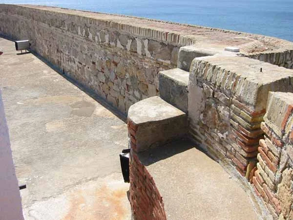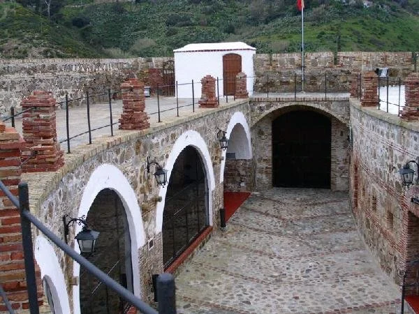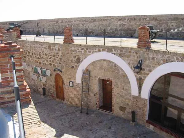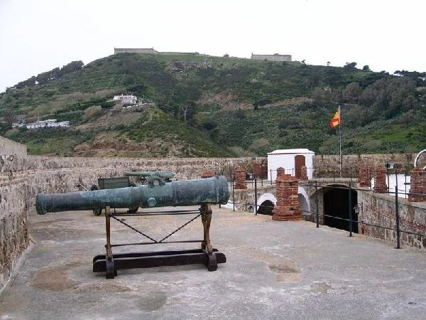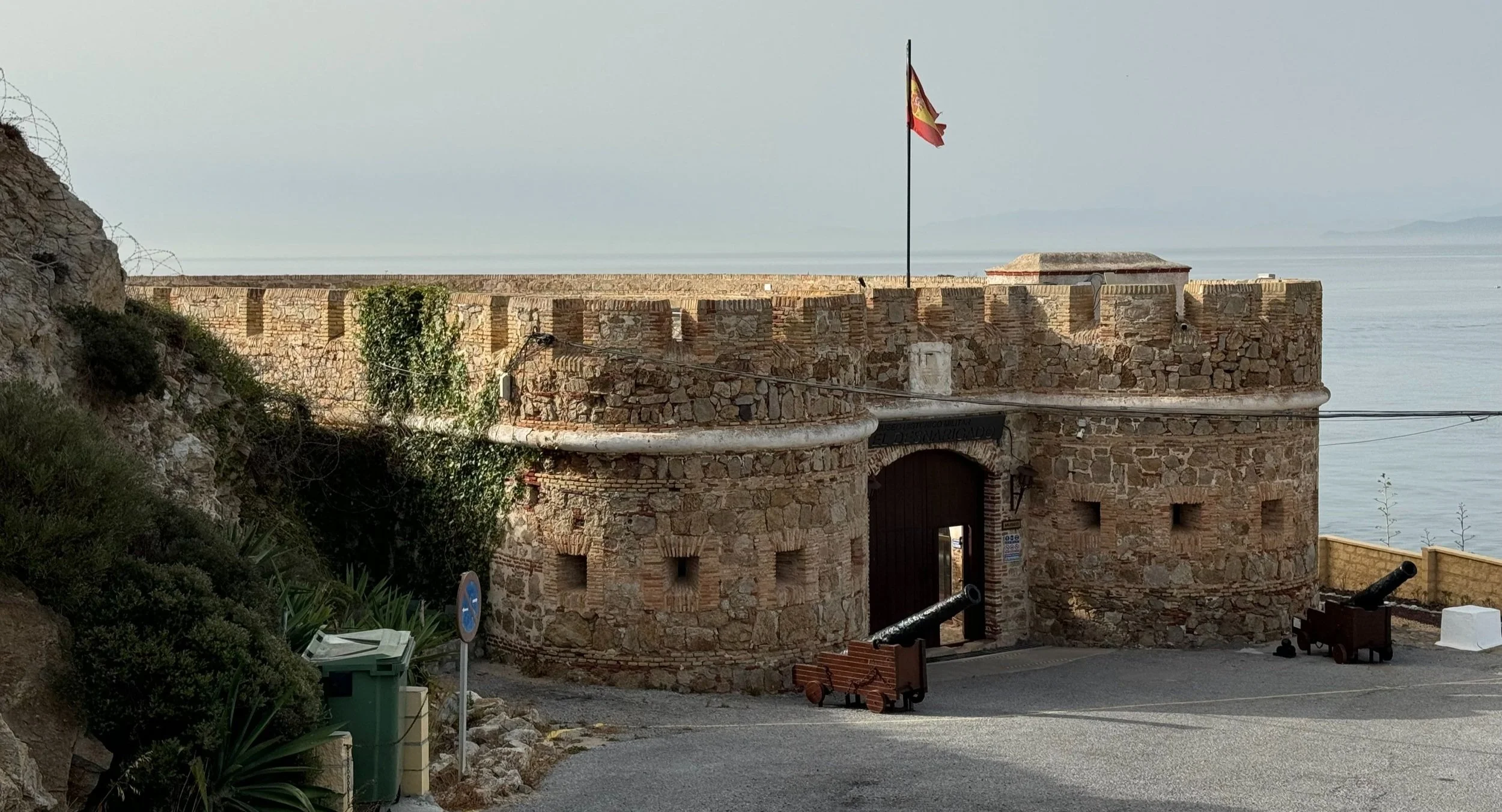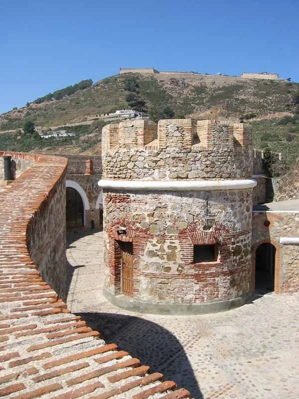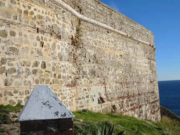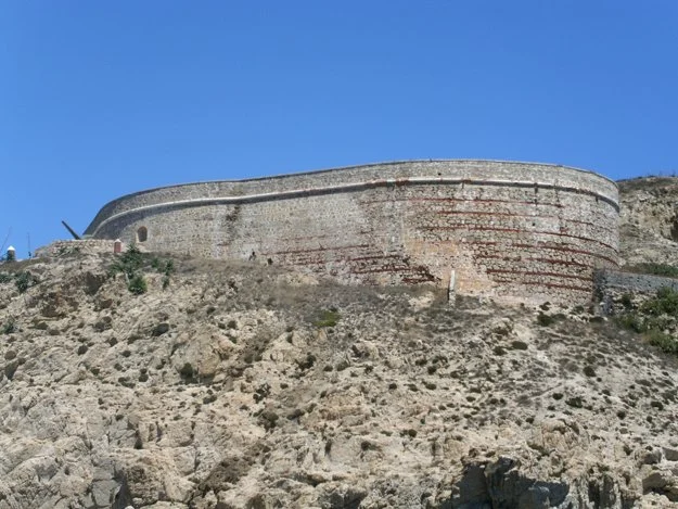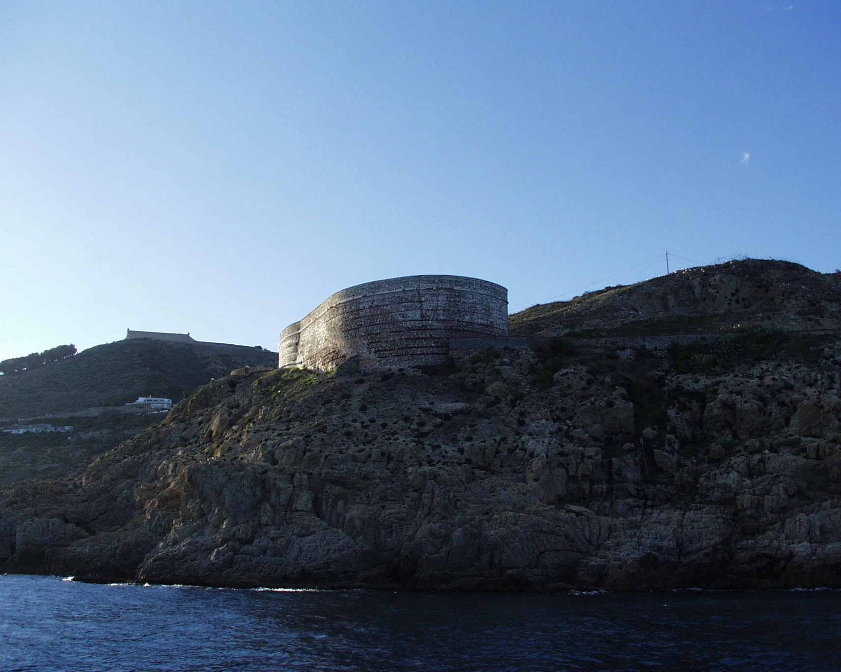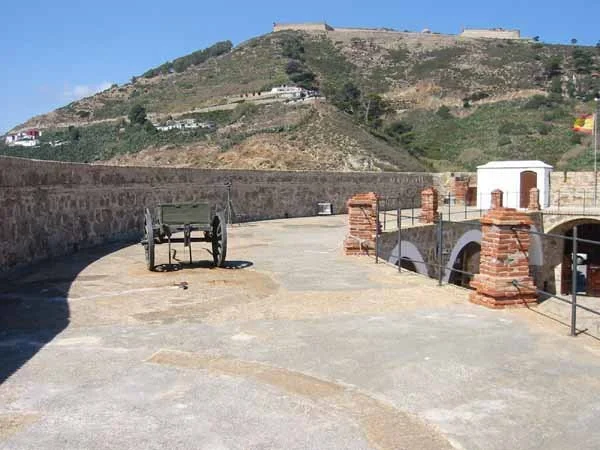 Fuerte de artillería costera moderno, diseñado conforme a los requisitos de la mitad del siglo XIX, con casamatas para emplazar las piezas principales. Está localizado en la esquina sudeste del monte Hacho. El denominado “Castillo del Desnarigado” corresponde a una fortaleza moderna, datando su estructura actual de 1863 o 1864 . Su planta presenta una interesante adaptación topográfica, lo que genera una forma que podría denominarse como orgánica, sinuosa y alargada en la parte correspondiente a las baterías acasamatadas, con otras construcciones complementarias y patios, tanto interior como lateral. Se trata de uno de los “pequeños fuertes, mejor que “reductos acasamatados” que recogen los estados técnicos de mediados del siglo XIX para la defensa costera. Tiene la fortificación una superficie de 1.280 m2. El material empleado en su construcción fue la piedra (extraída en su totalidad de las inmediatas canteras, situadas a unas decenas de metros hacia en NE) y el ladrillo macizo unidos mediante argamasa compuesta de cal, arena y pequeñas piedrecillas de las playas próximas. El Fuerte consta de dos cuerpos con planta similar a una corona circular unidos por el NO mediante un muero donde se practicó la Puerta Principal. Sobre su Puerta Principal se encuentra una reproducción del Escudo de España vigente desde la anexión de Portugal en época de Felipe II (1.581) hasta finales del siglo XVII (reinado de Carlos II). Dicha puerta está flanqueada por dos torreones de 6 metros de altura, coronados de almenas, y con 5 troneras para la fusilería a unos 2 metros de la base. La torre derecha, mantiene su estructura original con los elementos suprimidos en su gemela y escalera que se prolonga hasta la azotea del cuerpo Oeste.