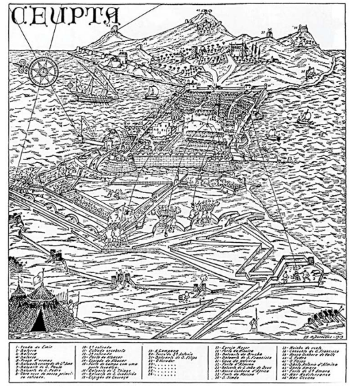 En estas fechas Ceuta contaba con un total de 11 enclaves fortificados: el Mirador, el Caballero de la Herrería Vieja, el baluarte de San Antón, la cortina que estaba entre los baluartes, el de San Sebastián, la Coracha, la Puerta del Sillero, la cortina correspondiente, el Pinedo, el baluarte de la Puerta Vieja y el Caballero de San Pedro. En 1585, cuando Jorge Seco realiza su visita, se habían construido cuatro baluartes más: el de San Antonio o del Caballero; el de San Simón, también llamado de la Peña de la Sardina o Puerta del Rey; el de San Sebastián o de San Luis, y el de San Pedro, situado en la bahía norte en la península de la Almina.