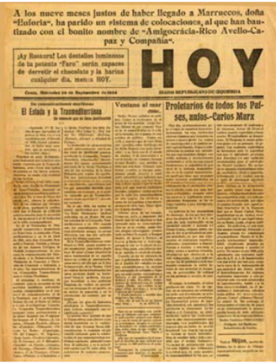 Hoy fue uno de los periódicos representativos de la izquierda republicana en Ceuta. En 1936 será el portavoz del Frente Popular. Su director Gaudencio Martín será fusilado. Archivo General de Ceuta, Fondo Fotográfico.
