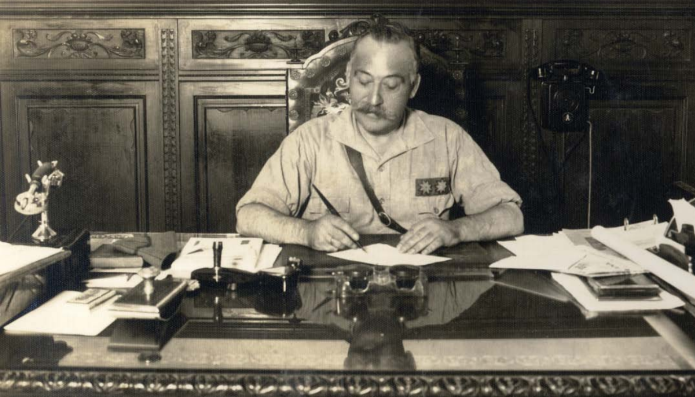 El delegado gubernativo Ramón Arechaga, el alto comisario Rico Avelló y el jalifa visitan la Feria de Muestras de Ceuta de 1934. Arechaga fue uno de los más activos y polémicos delegados en la etapa de hegemonía radical. Archivo General de Ceuta, Fondo Fotográfico.
