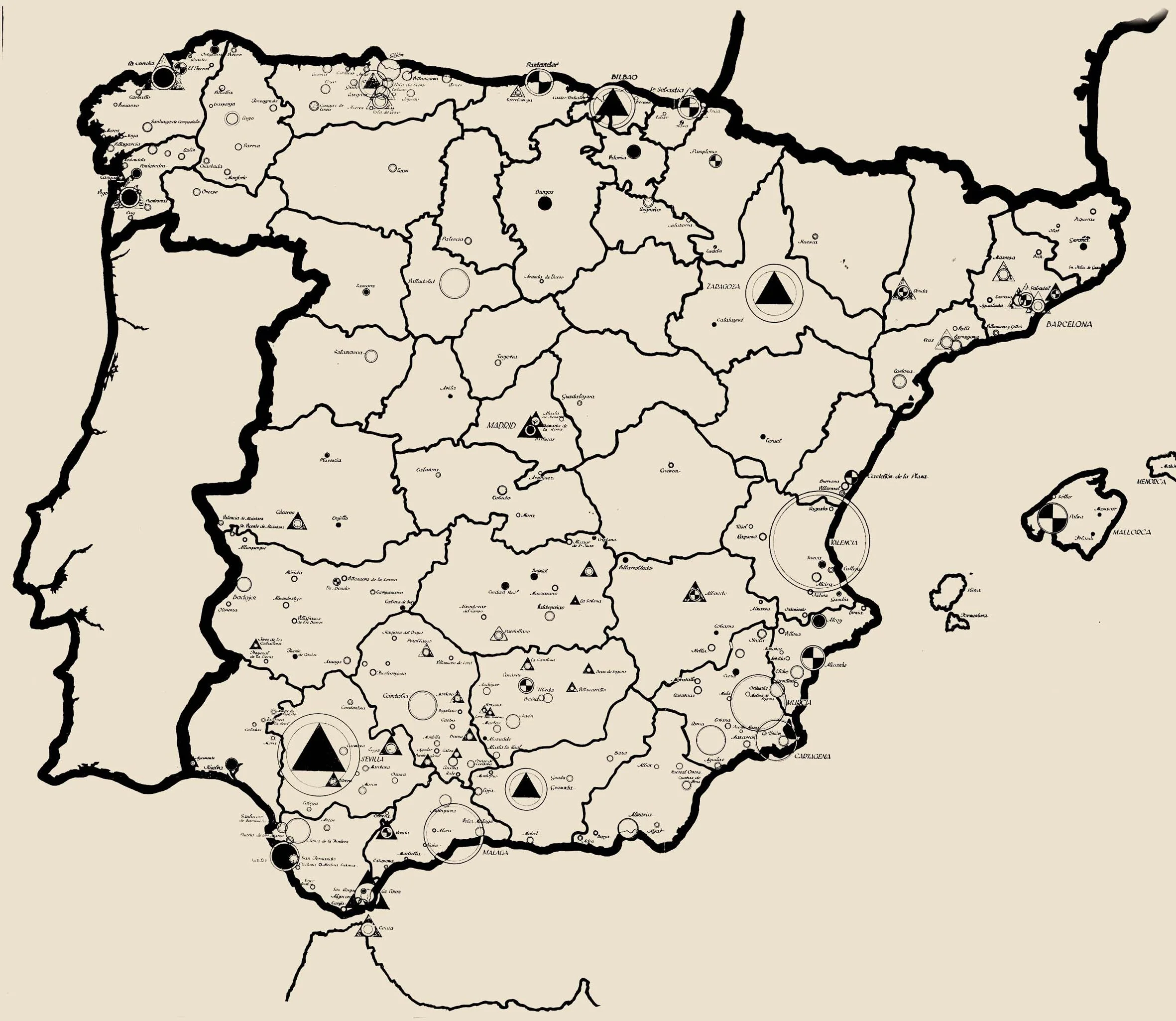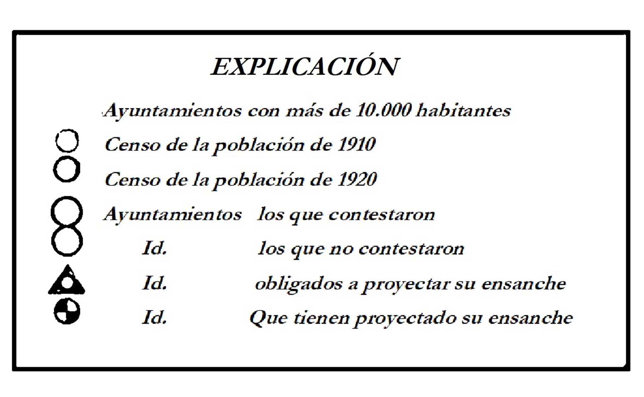 Estado de la urbanización en España. Mapa elaborado por Gustavo Fernández Balbuena con motivo del I Congreso Nacional de Urbanismo organizado por la Sociedad Central de Arquitectos en 1926, en el que desempeñó el papel de secretario. Ceuta figura como ayuntamiento obligado a realizar el proyecto de ensanche, reproducido en Gustavo Fernández Balbuena, Trazado de ciudades, Madrid: Otto Czekelius, 1932, p. 12.