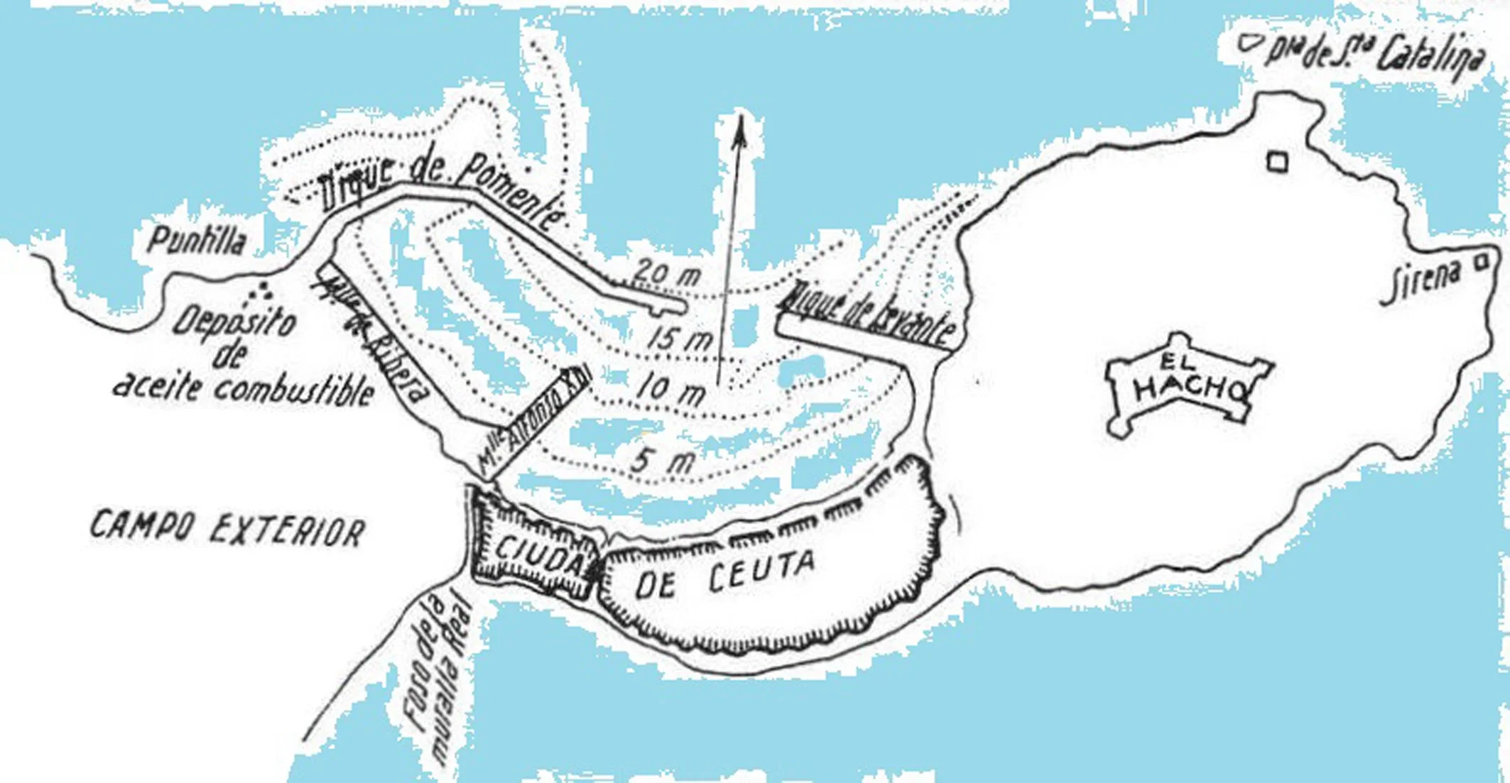 Plano del puerto de Ceuta. Manuel Mascaró Barba y Fernando Serrano Súñer, «Una vista a los puertos de Algeciras, Ceuta y Gibraltar», Revista de Obras Públicas, 1929, p.190.