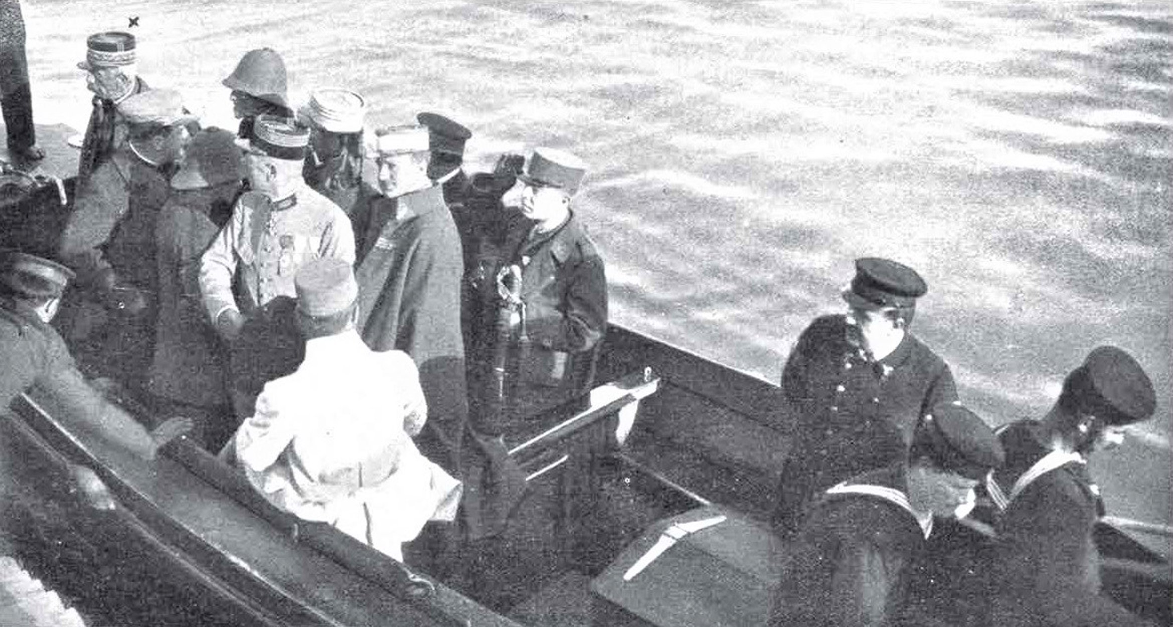 «El general Lyautey y sus ayudantes de campo en el momento de embarcar en la lancha que los condujo al crucero francés para partir rumbo a Rabat tras visitar Ceuta y Tetuán». Acompañado de Jordana, Alto Comisionado, visitaron en Ceuta las canteras de Benzú, el fuerte de Vebel-Amirer y el cuartel de Rebellín. La Ilustración Artística, XXXIV, nº 1773, 1915, p.854..